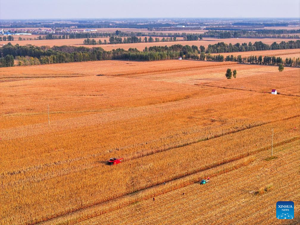 An aerial drone photo shows a harvester working in a corn field in Horqin Left Wing Rear Banner of Tongliao City, north China's Inner Mongolia Autonomous Region, Oct. 18, 2025. (Xinhua/Lian Zhen)