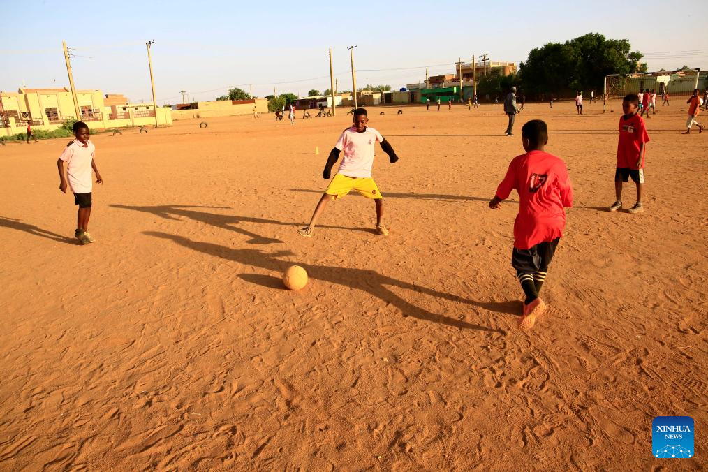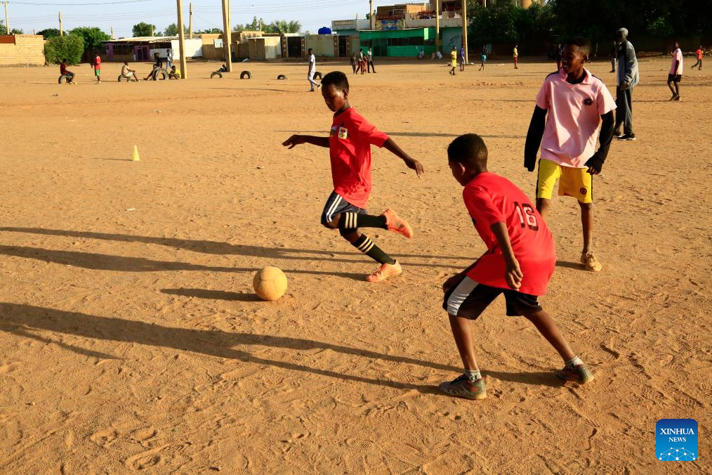 Children play football on a dirt field at Al-Iskan neighborhood, District 95, west of Omdurman, Sudan, on Oct. 19, 2025. (Photo by Mohamed Khidir/Xinhua)