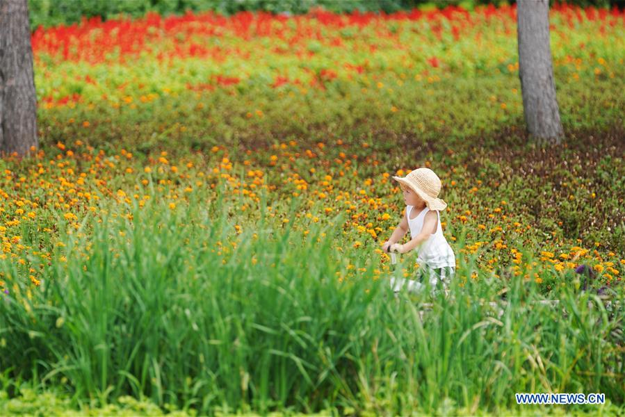 A child plays beside flowers at the Sun Island Scenic Area of Harbin, northeast China's Heilongjiang Province, Aug. 7, 2019. Sun Island Scenic Area of Harbin has attracted a lot of visitors to enjoy the coolness here. (Xinhua/Wang Jianwei)