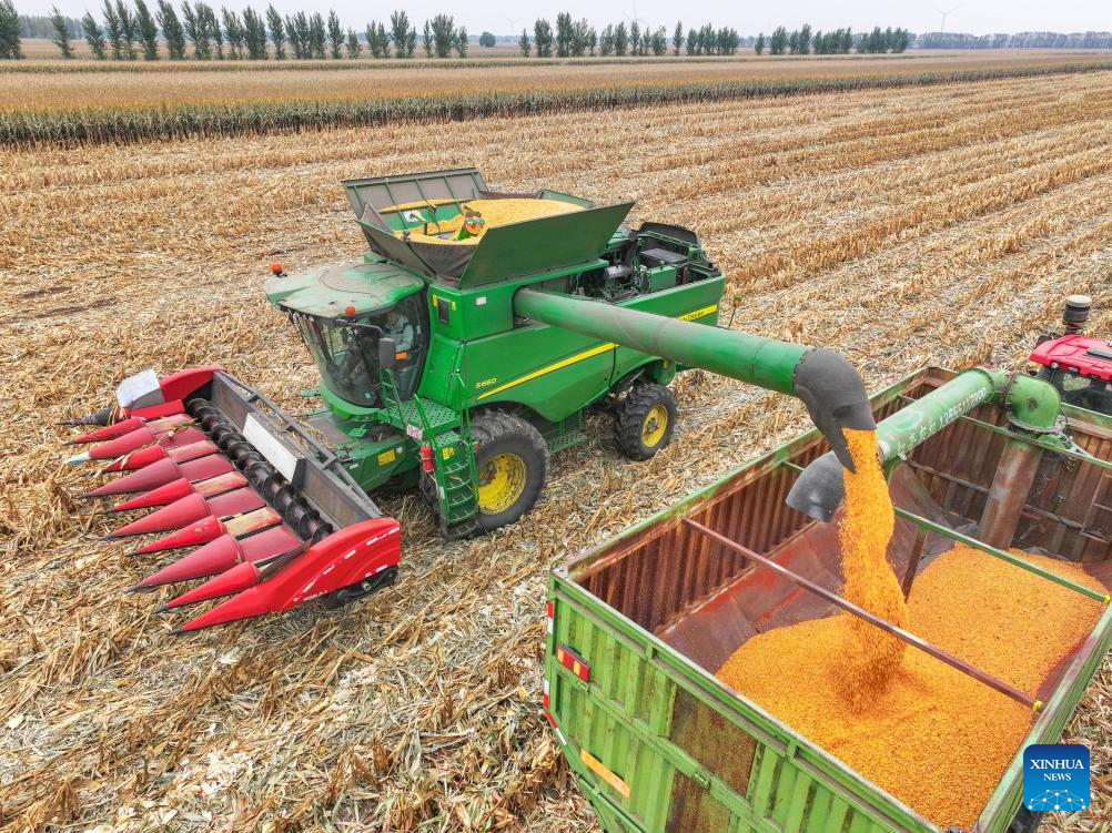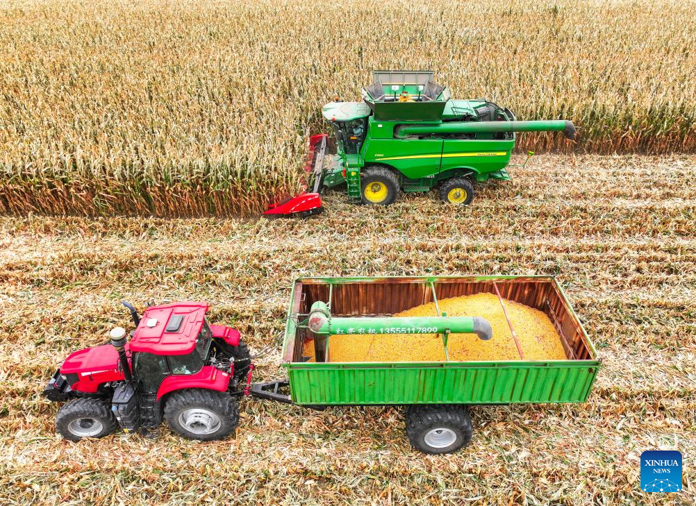 A harvester unloads corns in Horqin District of Tongliao City, north China's Inner Mongolia Autonomous Region, Oct. 14, 2025. (Xinhua/Lian Zhen)