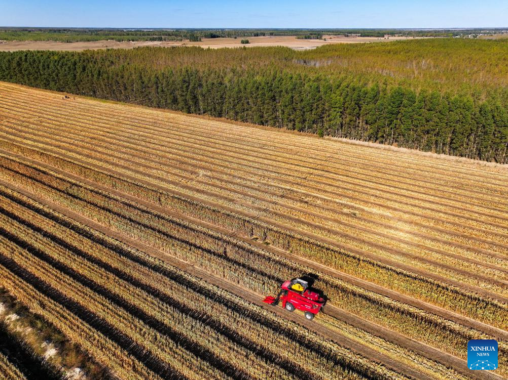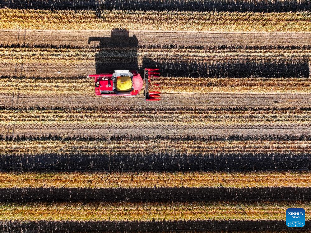 An aerial drone photo shows a harvester working in a corn field in Horqin Left Wing Rear Banner of Tongliao City, north China's Inner Mongolia Autonomous Region, Oct. 18, 2025. (Xinhua/Lian Zhen)