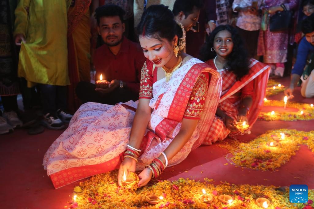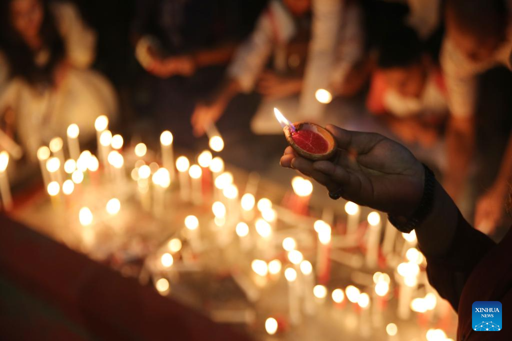 People light candles to celebrate Diwali, or the Hindu festival of lights, at a temple in Dhaka, Bangladesh on Oct. 20, 2025. (Photo by Habibur Rahman/Xinhua)