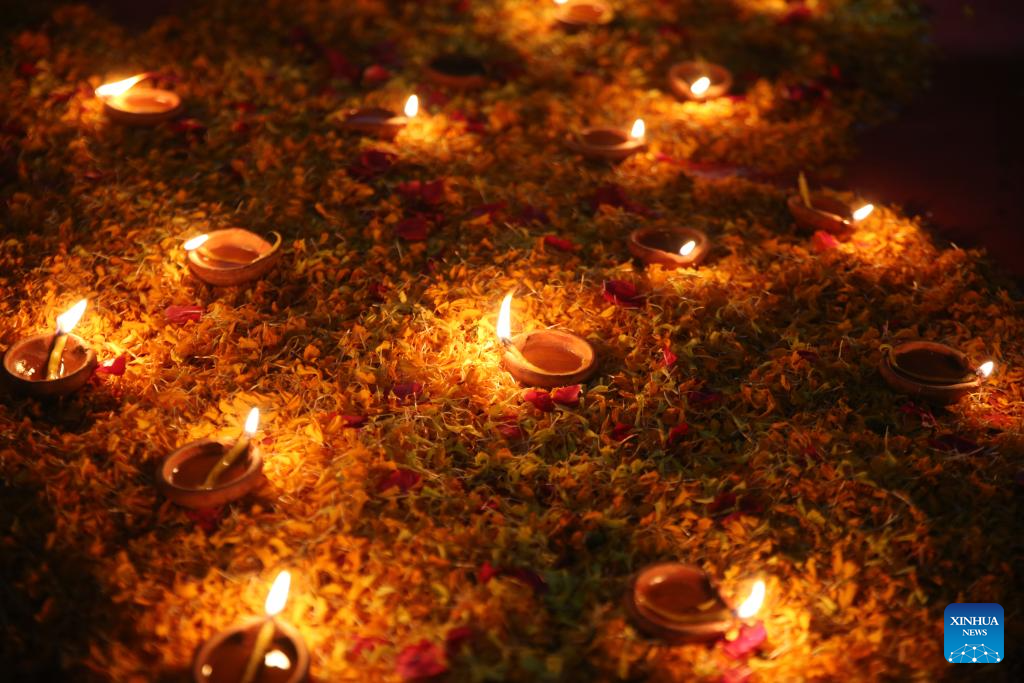 Oil lamps are lit to celebrate Diwali, or the Hindu festival of lights, at a temple in Dhaka, Bangladesh on Oct. 20, 2025. (Photo by Habibur Rahman/Xinhua)