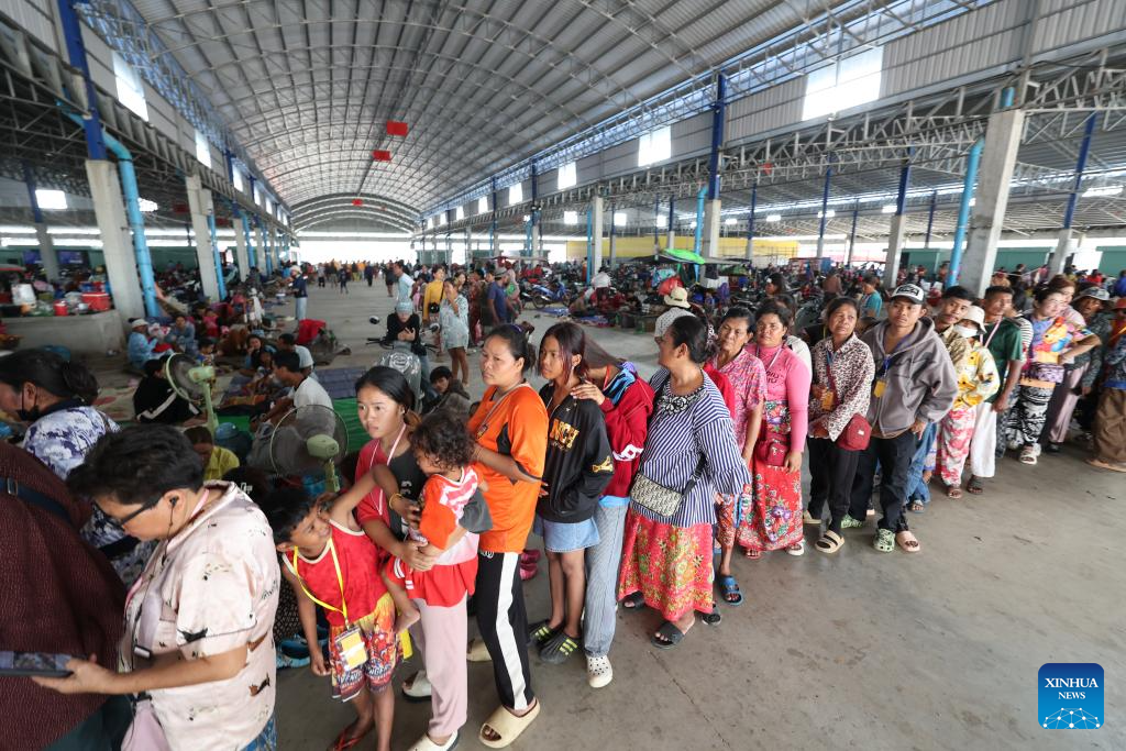 Cambodian evacuees queue to register for relief items at a safe zone in Banteay Meanchey province, Cambodia on Dec. 12, 2025. The number of Cambodian evacuees from the ongoing border fighting with Thailand has risen to more than 300,000 as of Friday afternoon, the Cambodian Ministry of Interior said in a press release. (Photo by Sovannara/Xinhua)
