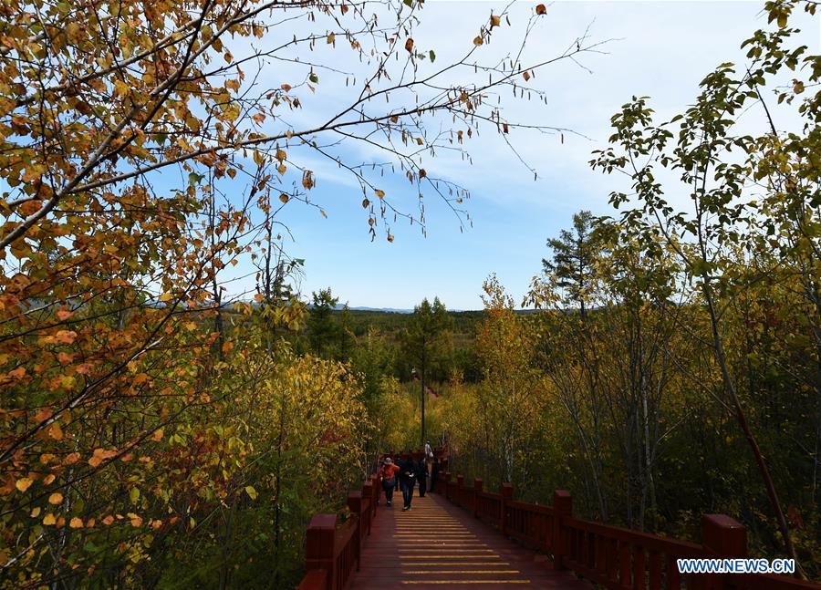 Tourists visit a scenic spot in Arxan, north China's Inner Mongolia Autonomous Region, Sept. 14, 2018. (Xinhua/Ren Junchuan)