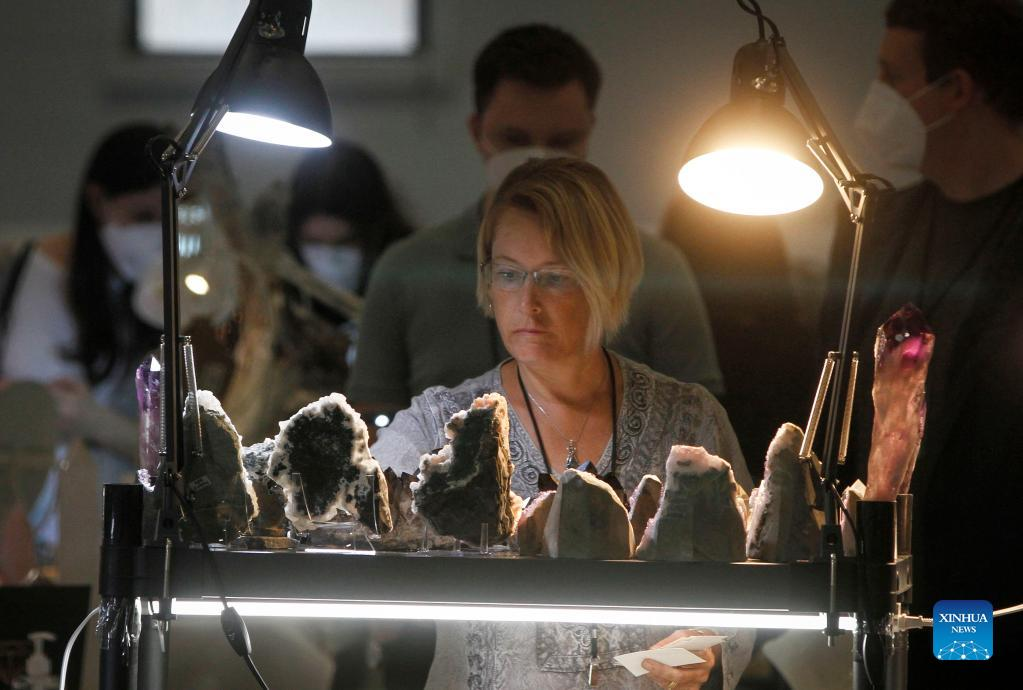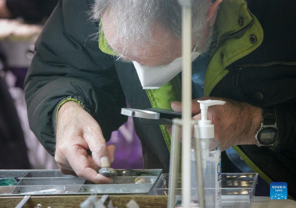 A visitor looks at gemstones displayed during the Gem and Mineral Show in Vancouver, British Columbia, Canada, on March 25, 2022. The three-day show features about 100 vendors from across Canada with their gem, mineral and rare fossil collections. (Photo by Liang Sen/Xinhua)
