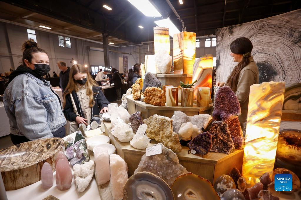 People look at gemstones displayed at a booth while visiting the Gem and Mineral Show in Vancouver, British Columbia, Canada, on March 25, 2022. The three-day show features about 100 vendors from across Canada with their gem, mineral and rare fossil collections. (Photo by Liang Sen/Xinhua)