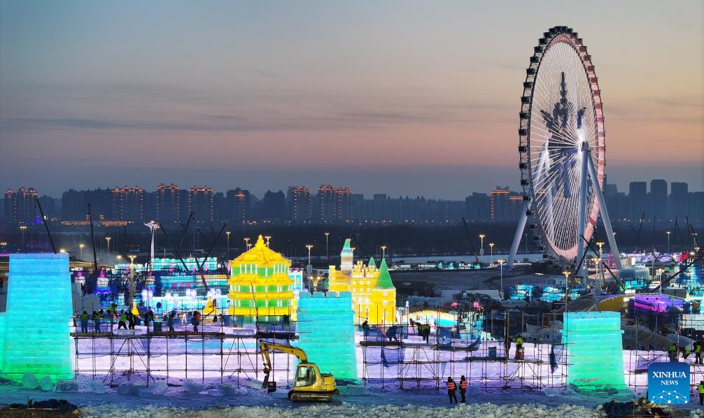 A drone photo taken on Dec. 12, 2025 shows the Ice and Snow World under construction in Harbin, northeast China's Heilongjiang Province. The 27th edition of Ice and Snow World has entered its final stage of construction. (Photo by Zhang Shu/Xinhua)