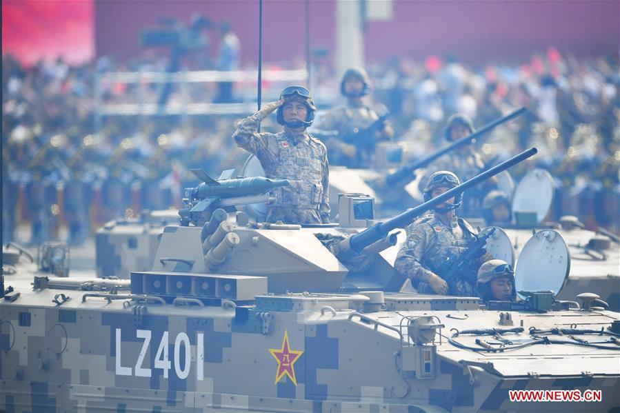 A formation of airborne fighting vehicles takes part in a military parade during the celebrations marking the 70th anniversary of the founding of the People's Republic of China (PRC), in Beijing, capital of China, Oct. 1, 2019. (Xinhua/Liu Xiao)