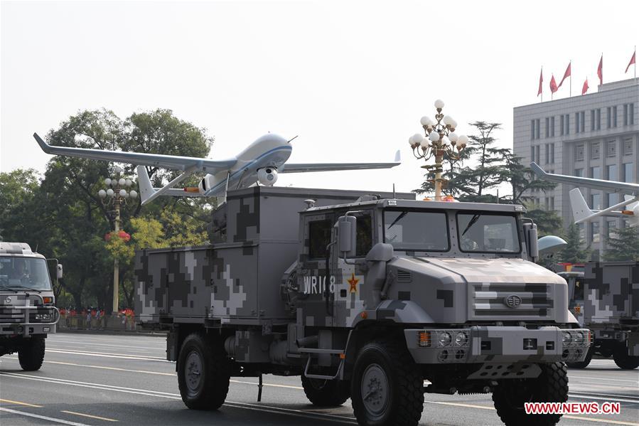 A formation of unmanned combat armaments takes part in a military parade celebrating the 70th anniversary of the founding of the People's Republic of China (PRC) in Beijing, capital of China, Oct. 1, 2019. (Xinhua/Fan Peishen)