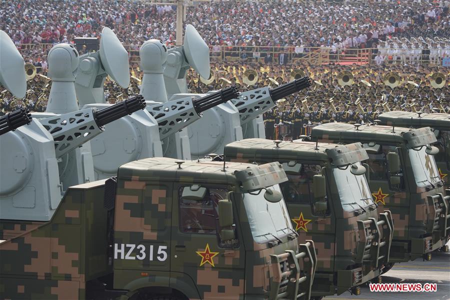 A formation of carrier-borne air defense weapons takes part in a grand military parade celebrating the 70th anniversary of the founding of the People's Republic of China in Beijing, capital of China, Oct. 1, 2019. (Xinhua/Xing Guangli)