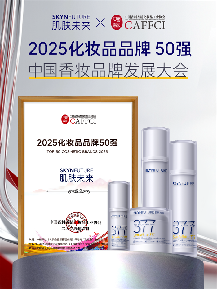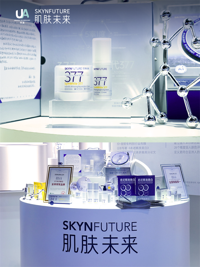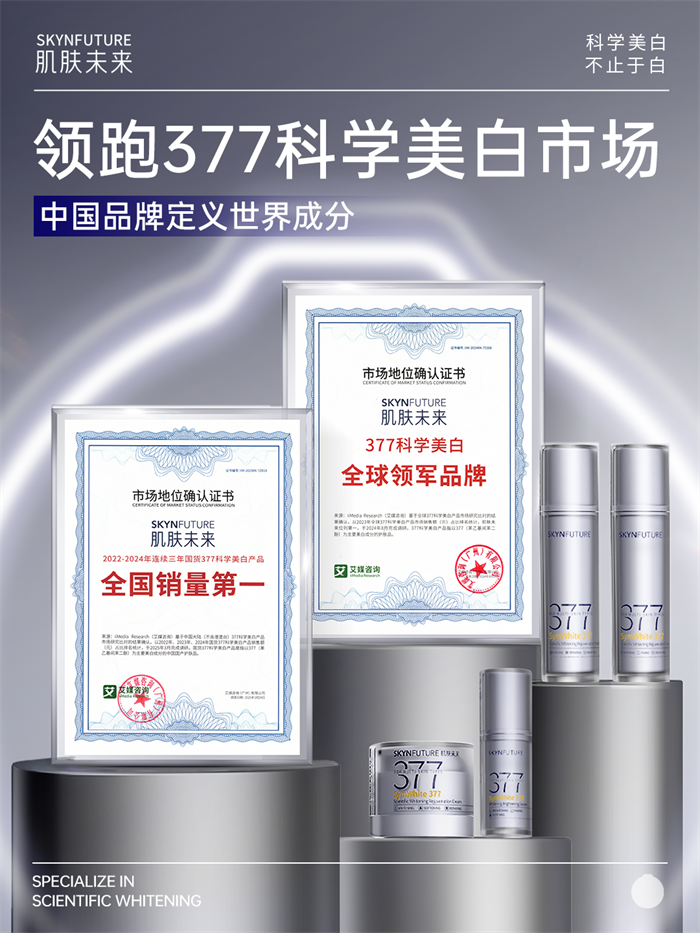 搭载“科白芯”的二代377系列同步在展会上亮相。其中二代377面霜聚焦“减黑淡斑”,二代377水乳则主打“去黄透亮”。品牌连续3年斩获“国货377科学美白产品全国销量第一”,并入选中国香妆协会“2025年度化妆品品牌50强”。