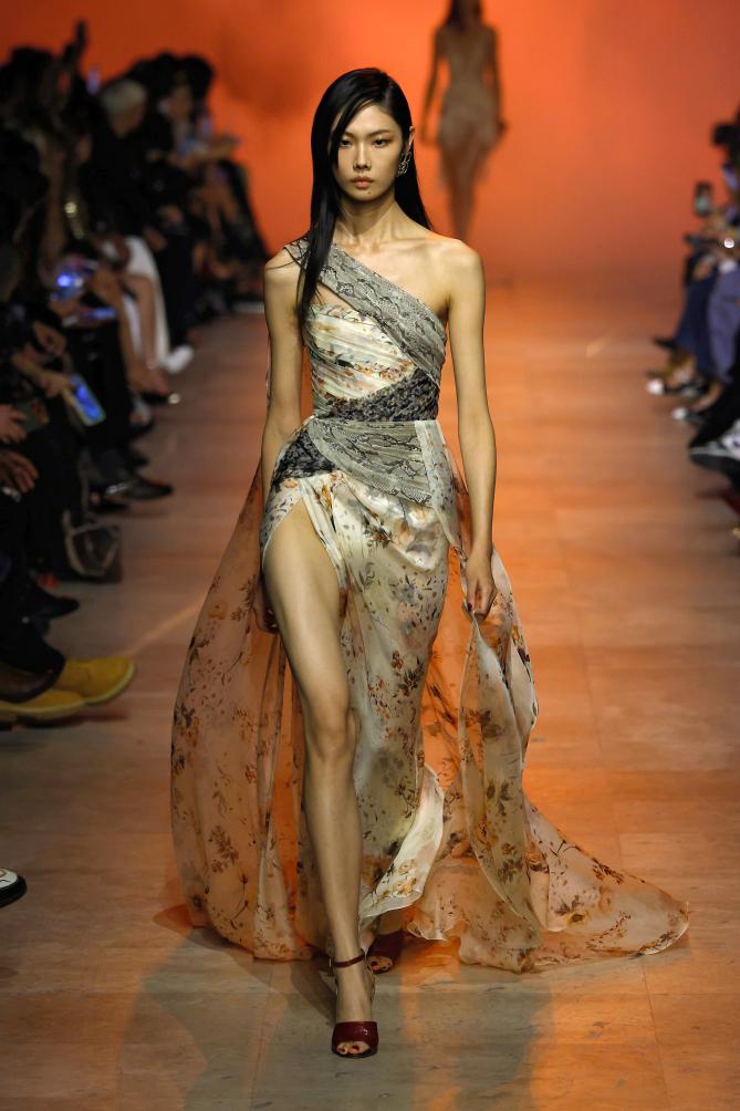 10月4日,模特在法国巴黎时装周上展示Elie Saab品牌的2026春夏新品成衣。