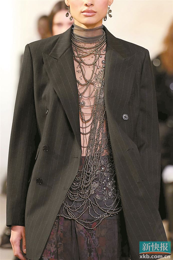 透视感较强的薄纱内搭可配大量感配饰,平衡整体造型感。
