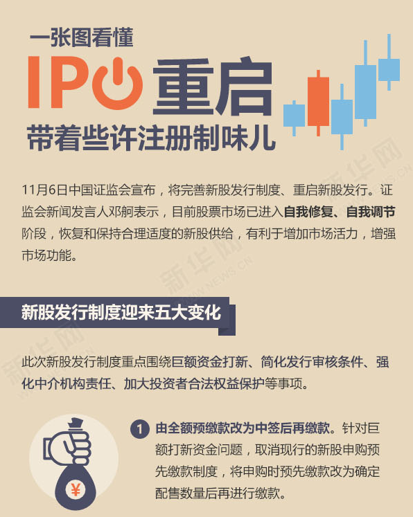 ????新華網北京11月6日電(記者 屈紹輝)6日中國證監會宣布,將完善新股發行制度重啟新股發行。證監會相關負責人表示,此次改革重點圍繞解決巨額資金打新、簡化發行審核條件、強化中介機構責任、加大投資者合法權益保護等事項,這是新股發行體制改革的進一步深化,朝著股票注冊制改革的方向又邁出了堅實的一步。
