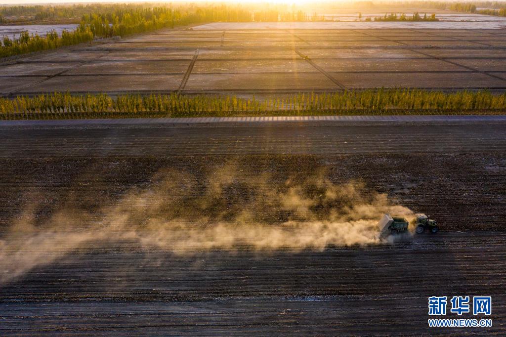 在新疆阿克蘇地區沙雅縣古勒巴格鎮,農用機械在一處采收完的棉田里進行殘膜回收、秸稈粉碎還田作業(2020年10月23日攝,無人機照片)。阿克蘇地區沙雅縣地處塔里木盆地西北緣,是產棉大縣。近年來,沙雅縣先后吸引棉紡、農機制造、節水設備制造等多家企業落戶。