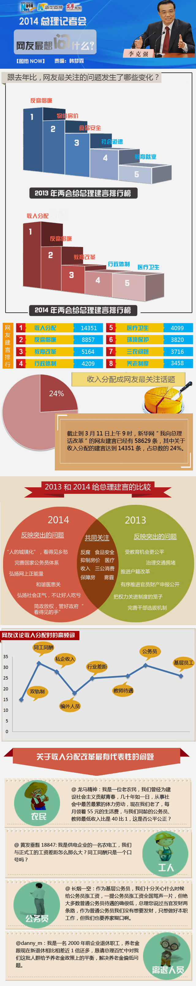 3月13日上午,國務(wù)院總理李克強(qiáng)將與中外記者見面,回答大家的問題。這是李克強(qiáng)總理第二次總理記者會,今年新華網(wǎng)推出了大型互動專題"我和總理話改革",收到了數(shù)萬條網(wǎng)友建言,在這些建言中,哪些問題是網(wǎng)友最關(guān)心的,如果是網(wǎng)友在記者會上提問,他們最想問什么?