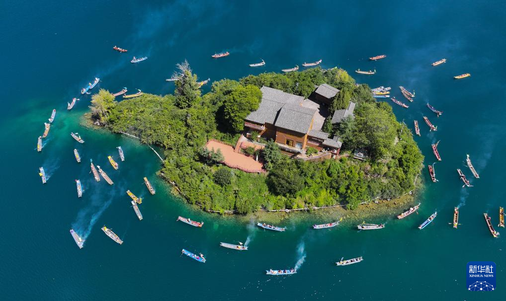9月16日,2025年四川省凉山州首届泸沽湖转山转海节开幕,当地群众驾着猪槽船在泸沽湖的王妃岛转海(无人机照片)。转山转海是居住在泸沽湖附近摩梭人的重要民俗。