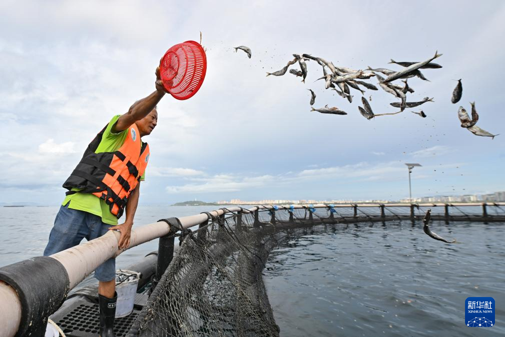 9月17日,陵水黄鳍金枪鱼海上养殖示范基地工作人员在投喂金枪鱼。经过数年技术攻关,中国水产科学研究院南海水产研究所在海南陵水建成国内首个黄鳍金枪鱼海上养殖示范基地,目前已实现人工产卵孵化。