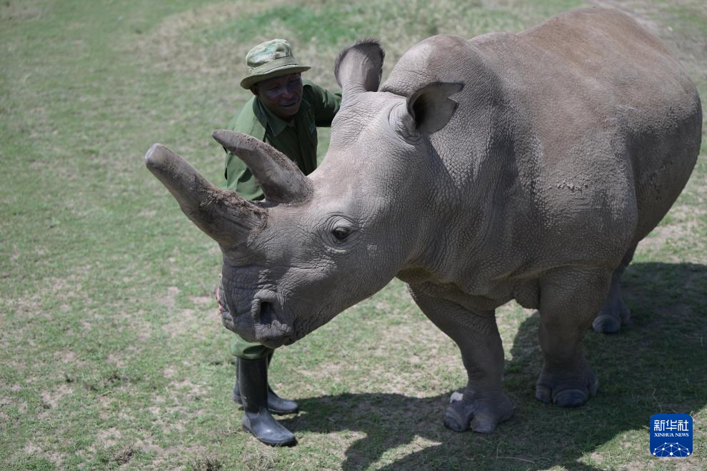 10月7日,在肯尼亚中部莱基皮亚郡奥尔佩杰塔自然保护区,工作人员与雌性北方白犀牛“法图”互动。