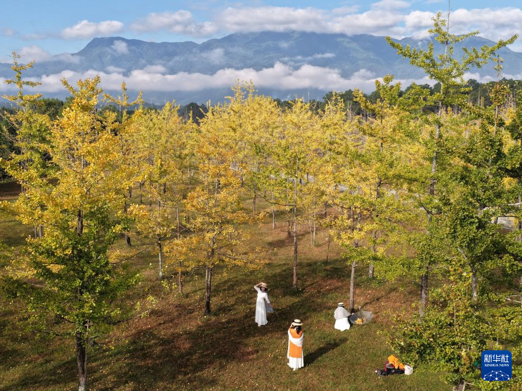 11月15日,游人在云南省腾冲市固东镇江东村的银杏林游玩(无人机照片)。