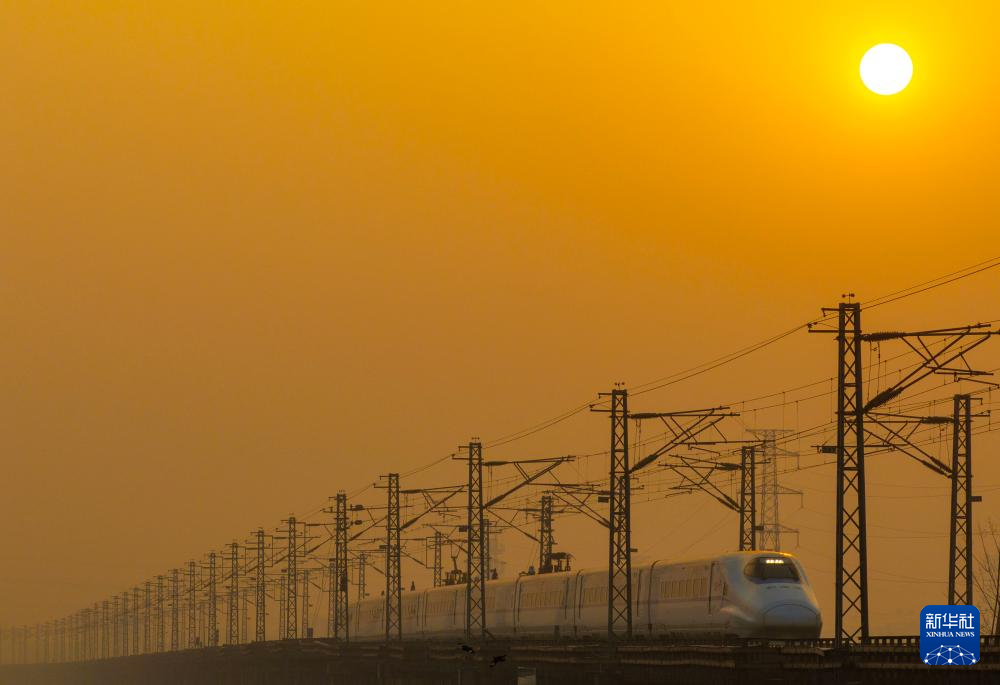 1月25日,列车行驶在江苏省泰州市海陵区境内(无人机照片)。