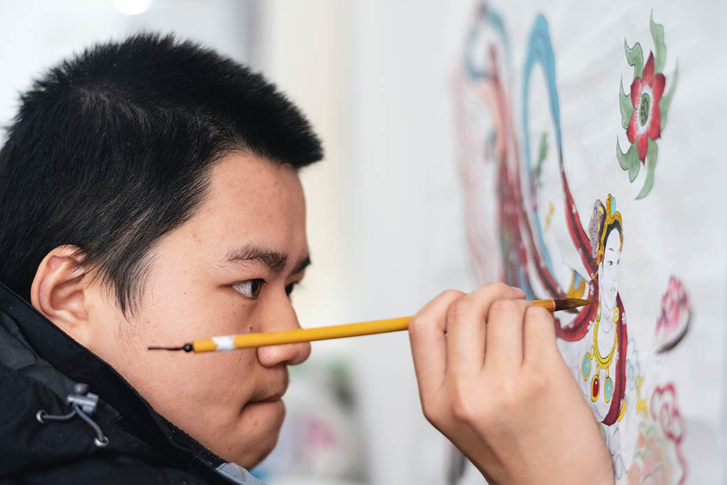 在四川省成都市一家中医盲人理疗店里,“瓷娃娃”胡星在创作绘画作品