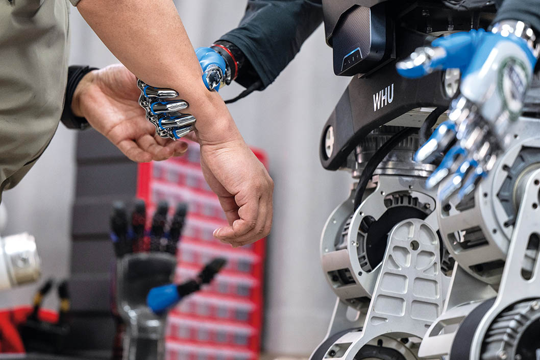 3月19日,在武汉大学机器人学习算法与软操作实验室内,研发团队在对“天问”人形机器人进行研发调试