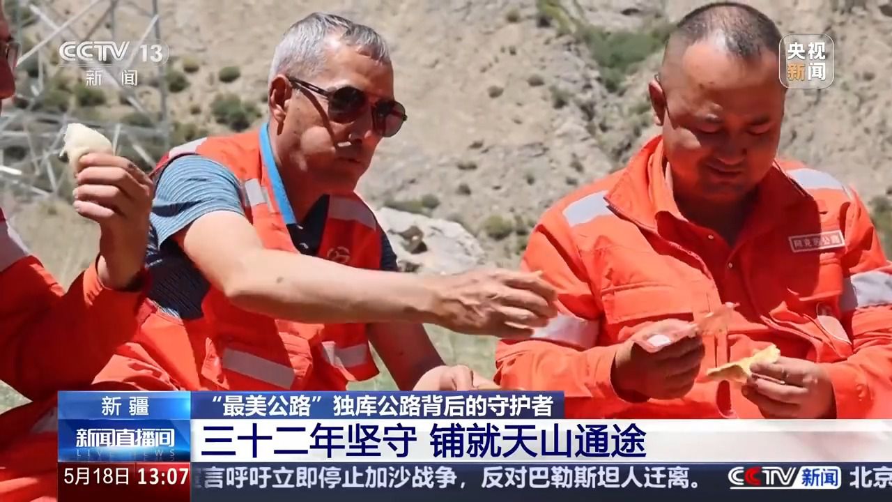 下午两点多,亚克甫招呼大家停下来吃午饭。这几天,亚克甫和同事们要抢在独库公路通车之前,把冰封了一个冬天的道路养护好。他们经常没时间回到养护站休整,午饭也只能在路边对付一下。