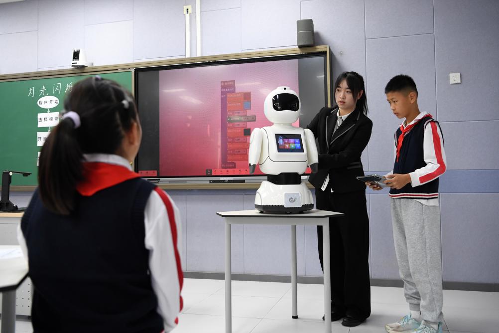 10月15日,在北京市海淀区第四实验小学《闪烁信号》主题人工智能公开课上,学生通过自己编写的程序向机器人发指令。