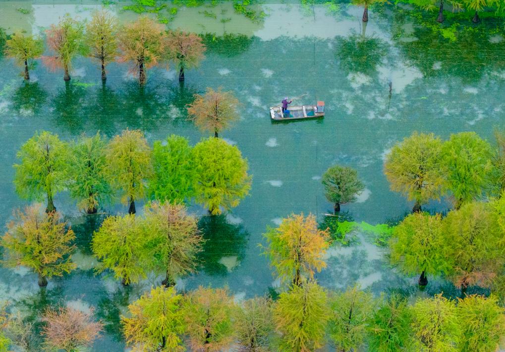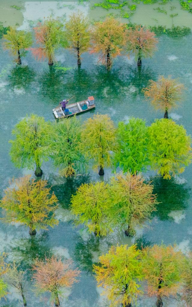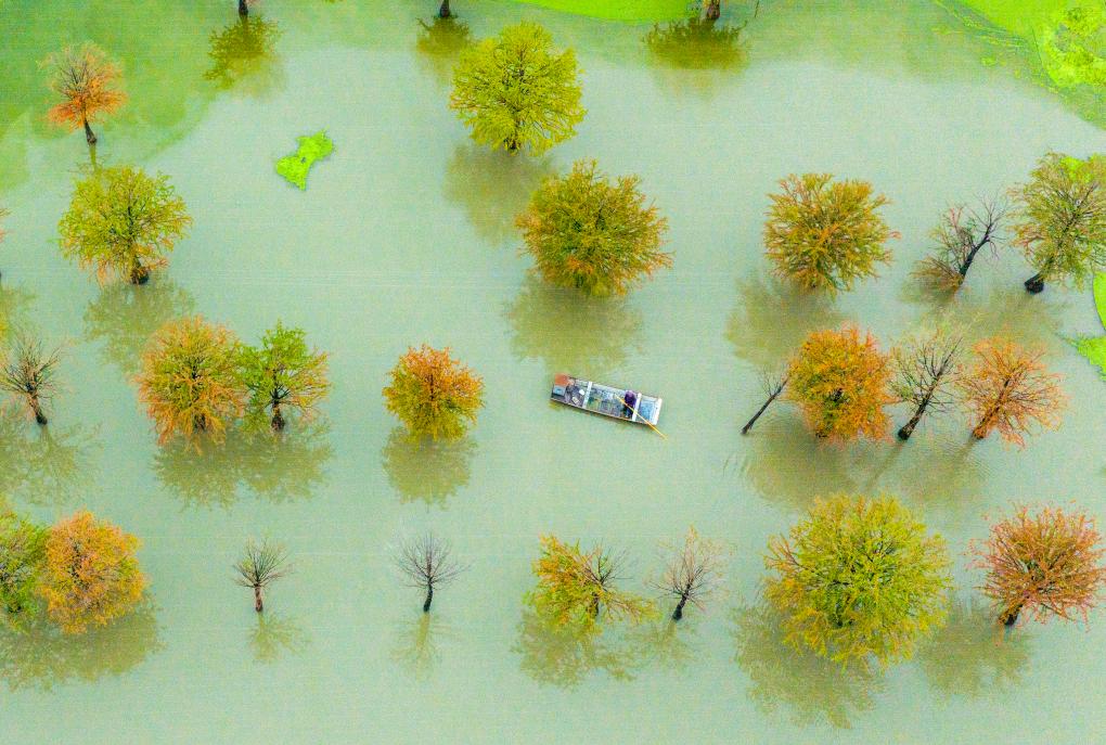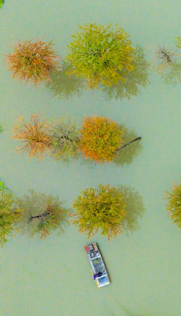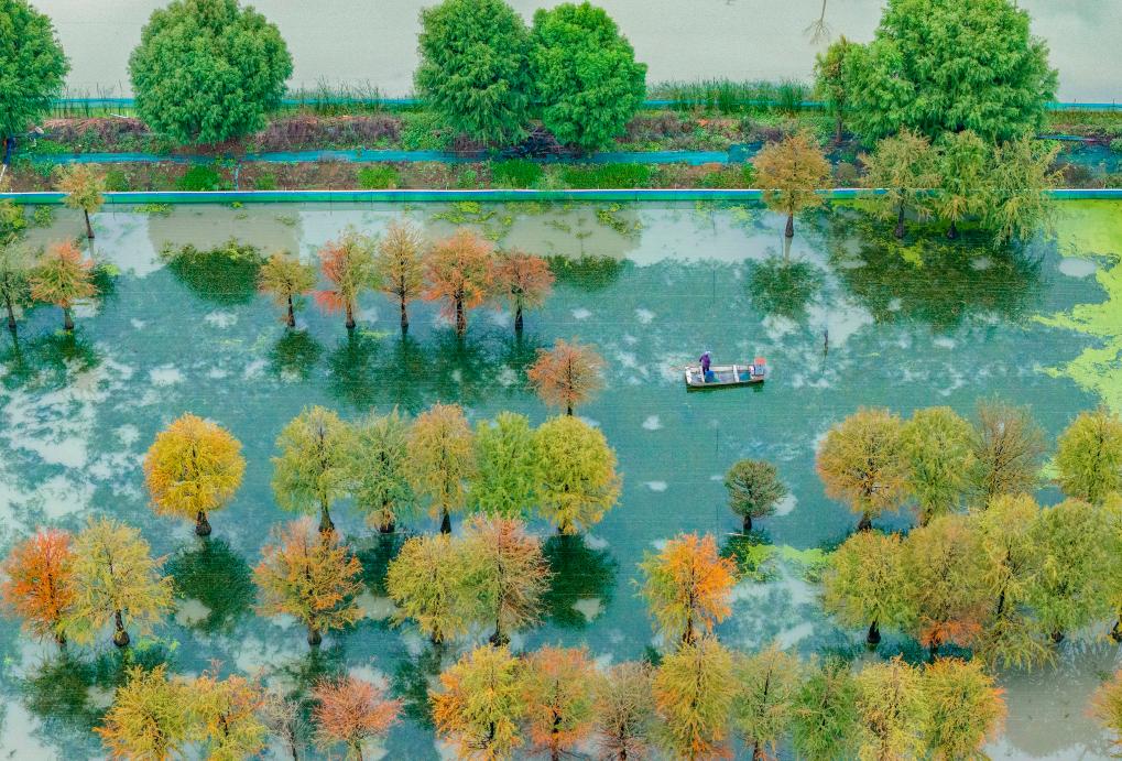 2025年10月17日,在江苏省宿迁市泗洪县临淮镇水杉林螃蟹养殖基地,工作人员泛舟穿梭在色彩斑斓的水杉林间,查看螃蟹生长情况,碧绿的湖水与绚丽的林景相映成趣,构成一幅生态美景。