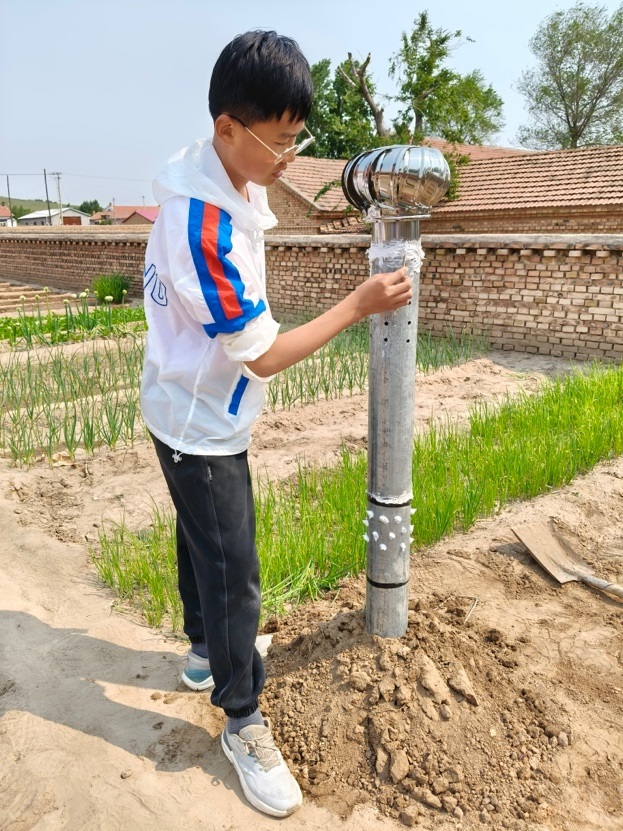 没有实验室,就把农家小院的菜地改造成试验地;没有实验器材,就从五金店买来钢管,收集废旧塑料瓶。“发明团队”中,贾明轩是“总工程师”,掌控全部创意和发明进度;年过七旬的爷爷当起“发明助理员”,在一旁出谋划策;爸爸成为“发明操作员”,帮着切割、钻孔、装运、挖坑、埋管;妈妈充当“发明记录员”,用手机拍摄发明过程。