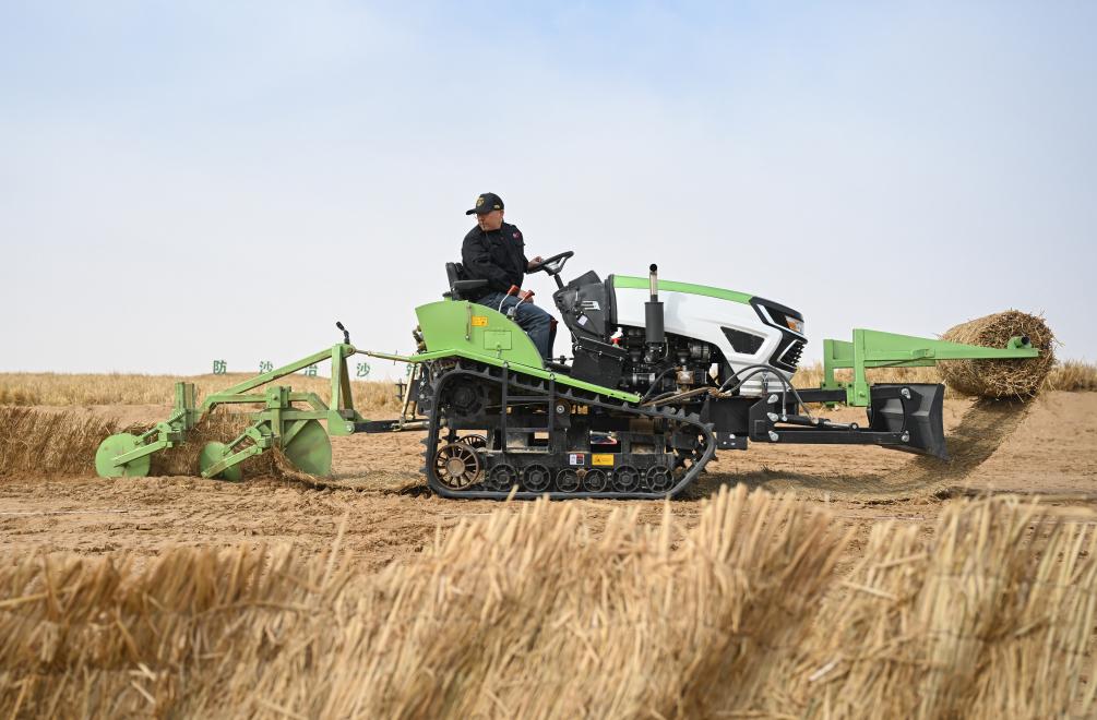 2月28日,工人在内蒙古阿拉善盟境内的乌兰布和沙漠驾驶小型履带沙障机作业。