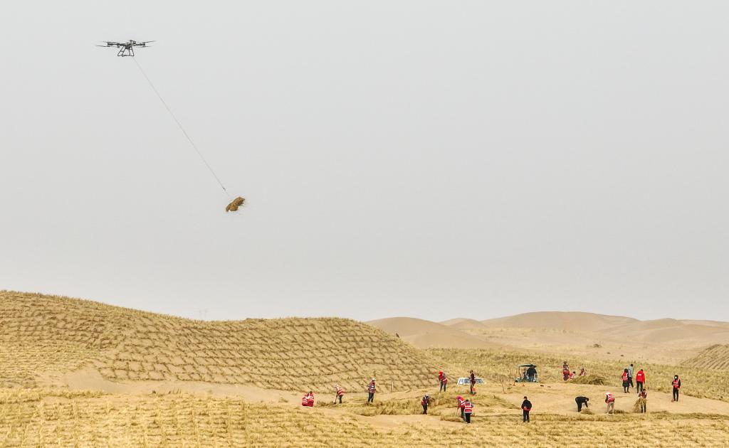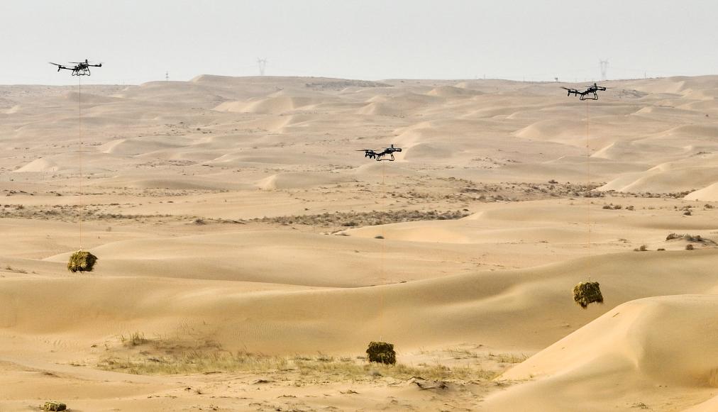 2月28日,工人在内蒙古阿拉善盟境内的乌兰布和沙漠接收无人机运送的草料。