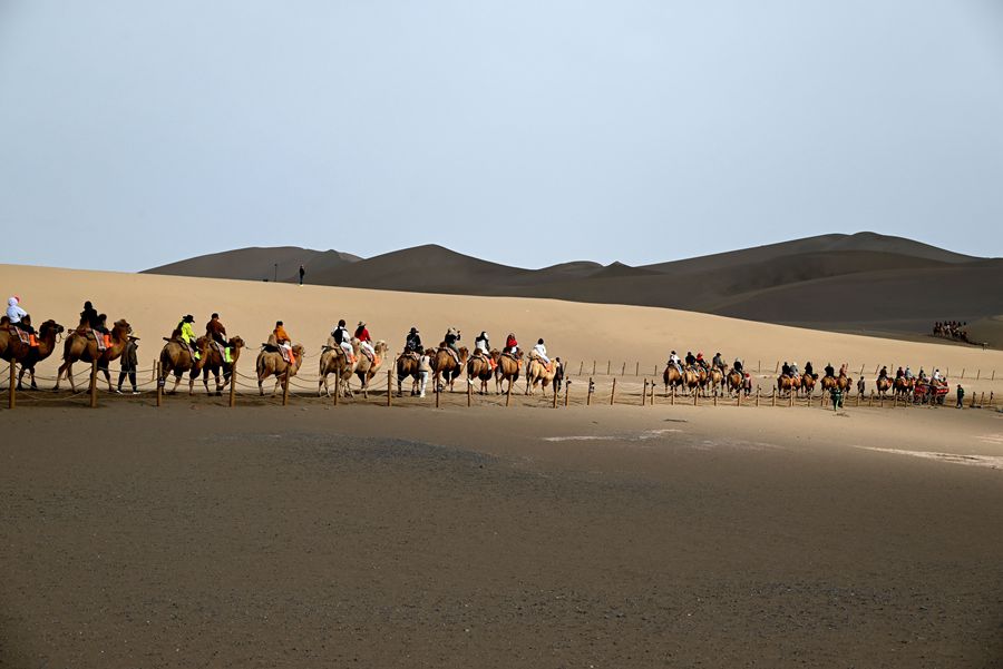 国庆、中秋双节将至,节日氛围日益浓厚,多地景区游客增多,旅游逐渐“升温”。图为9月25日,游客在甘肃省敦煌市鸣沙山月牙泉景区游览。新华社发(张晓亮摄)