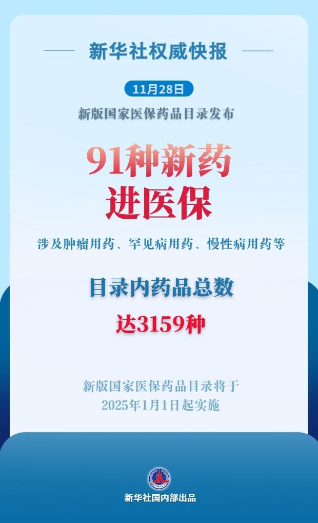 自成立以来,国家医保局已连续7年开展医保药品目录调整工作。本次调整后,目录内药品总数将增至3159种,肿瘤、慢性病、罕见病、儿童用药等领域的保障水平得到提升。新版国家医保药品目录将于2025年1月1日起实施。
