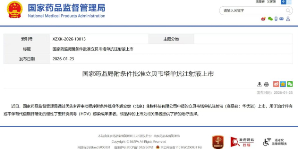 国家药品监督管理局近日附条件批准靶向乙肝和丁肝病毒PreS1的立贝韦塔单抗注射液上市,用于治疗伴有或不伴有代偿期肝硬化的慢性丁型肝炎病毒感染成年患者。该药由华辉安健(北京)生物科技有限公司自主研发,是病毒性肝炎治疗领域获批的抗体类药物。