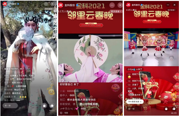 金科積極響應政府號召,也深度洞察人們對團圓的期盼,2月5日,集團品牌統籌舉辦了“金科2021鄰里云春晚”。通過一場鄰里春晚直播,打破了疫情防控常態化下的空間壁壘,讓全國百萬業主實現線上團圓。