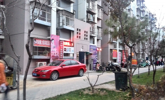 小區大門附近的樓棟放置了許多房屋租賃、美容、培訓等方面的廣告牌,小區內部也可見到居民開設的超市,顯示小區對內部的商業經營管制非常松懈。