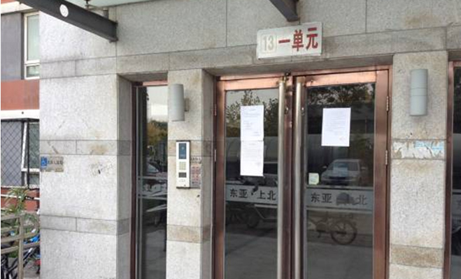 小區門口左右兩側分別有兩個大的水泥塊被安置在路障旁邊,使本就不寬敞的空地顯得局促。記者經過二三十米來到小區的二進門,發現有人正試圖說服門衛進入小區內部,一名身著制服的物業工作人員表示,使勁兒用腳踹,接著用腳幫忙打開了門。