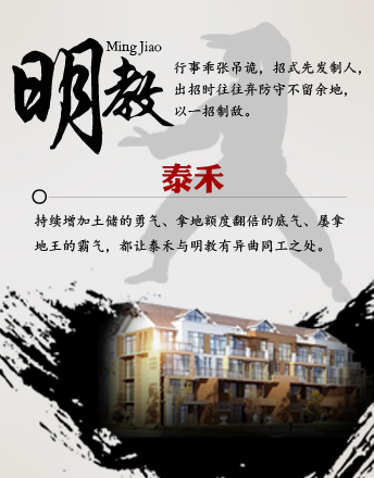 泰禾 明教 明教行事乖張吊詭,被各大名門正派視為異端。 泰禾幾乎就是業內土豪的代名詞,其花錢如流水的瘋狂拿地法、、屢屢直面地王的霸氣,都讓它與明教有異曲同工之處。