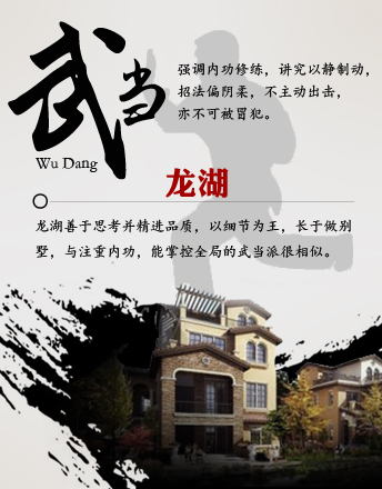龍湖 武當派 武當強調內功修練,以靜制動,一般不主動進攻,但亦不可輕易侵犯。 龍湖出手拿地都經深思,經營風格沉穩凌厲,重細節品質。與注重內功,看似被動實能縱觀全局的武當派很像。