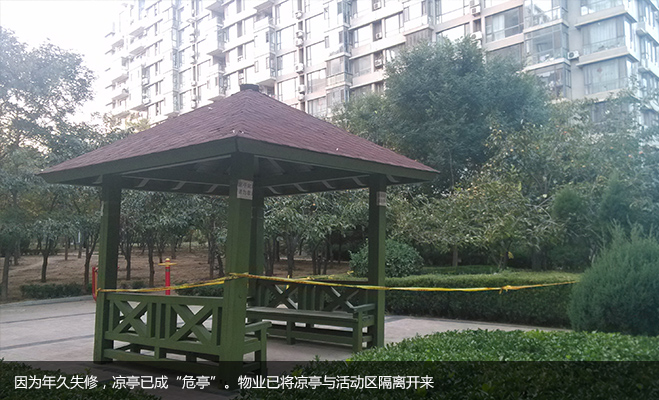 記者在調(diào)查中還發(fā)現(xiàn)了位于小區(qū)中心廣場的一處涼亭,周邊被圍上了一圈警戒帶。有居民告訴記者,這個(gè)涼亭因?yàn)槟昃檬蓿F(xiàn)已成了“危亭”,需要及時(shí)翻新或是重建,目前物業(yè)只是將亭子與居民活動(dòng)區(qū)隔離開來,并沒有進(jìn)一步的修整動(dòng)作。