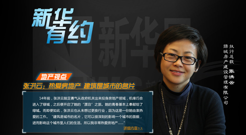主辦:新華網 執行:新華網采訪部 新華網房地產事業中心 總編輯/總策劃:袁韻、尹曉波 美編:張雯雯、王茜 專題制作:尹莉