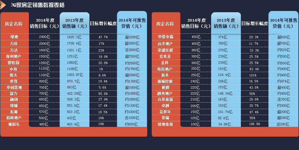 | 近日,多家上市房企陸續發布了2013年的年報,對于2014年的業績目標以及市場走勢,各家房企有著不同的解讀。萬科作為行業翹楚,其2000億元的年度銷售目標相對保守; 萬達、綠地均為2400億元的目標則是超越萬科,來勢兇猛;而碧桂園、融創、佳兆業、旭輝等公司則大幅提高了今年的銷售目標。在年初部分城市樓市陷入低潮之時,顯然開發商對2014年全年的市場環境相對看好。穆迪投資者服務公司則指出,中國房企銷售增長在2013年中已開始呈現放緩跡象,預計中國房地產開發商的合約銷售增長,將由去年的26.6%大幅放緩至今年的10%左右。 | ||