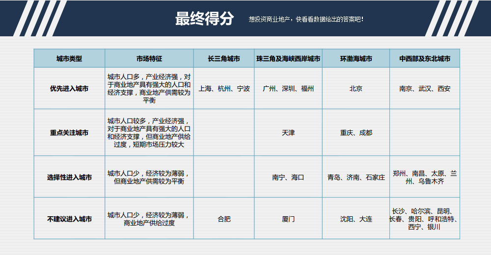 | 北京、上海、廣州零售規模領先于其他城市,為商業地產帶來直接的旺盛需求,深圳、天津、重慶、杭州、南京、武漢、成都等城市位于第二梯隊,海口、西寧、銀川則較弱。 |