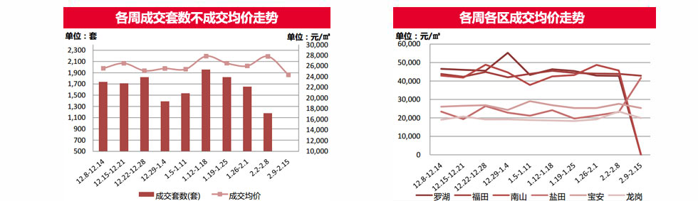 由于春節(jié)假期將至,并且本周(2.9-2.15)無新盤入市,深圳一手住宅成交套數(shù)及成交面積下跌均接近八成;成交均價下跌超一成。