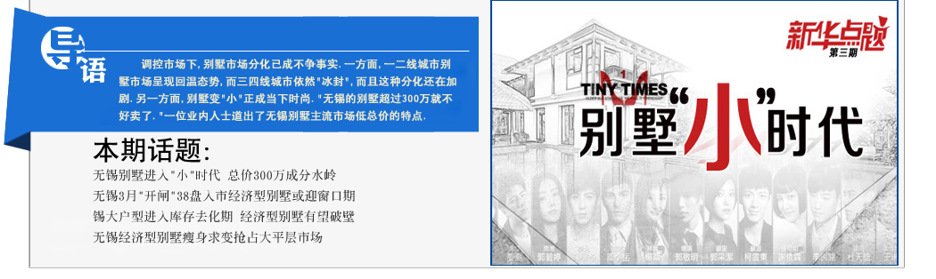 從無錫近幾年別墅市場來看,獨(dú)棟別墅幾乎在市場絕跡,包括弘揚(yáng)三萬頃、半山一號(hào)、南豐御園等馬山別墅幾乎處于銷售停滯狀態(tài),個(gè)別項(xiàng)目年銷售不過個(gè)位數(shù).而據(jù)個(gè)別項(xiàng)目內(nèi)部人士透露,由于別墅總價(jià)太高,加上限購限貸政策,別墅幾乎處于停銷狀態(tài),有的工地都已停工,看上去像爛尾樓,客戶購買的信心就更加小了.