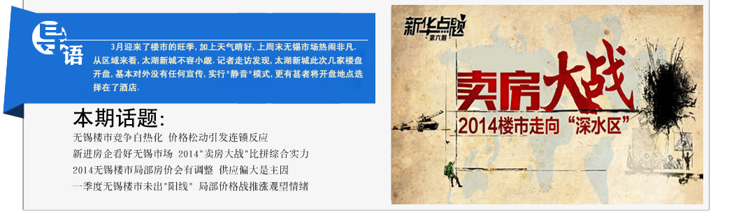 3月迎來了樓市的旺季,加上天氣晴好,上周末無錫市場熱鬧非凡。從區(qū)域來看,本周末太湖新城不容小覷,萬科信成道、綠城玉蘭花園、蘇寧悅城等樓盤均有開盤加推動作。記者走訪發(fā)現(xiàn),太湖新城此次幾家樓盤開盤,基本對外沒有任何宣傳,實(shí)行“靜音”模式,更有甚者將開盤地點(diǎn)選擇在了酒店。