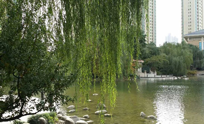 記者當天在小區內也看到,亭、臺、橋、木棧道交相映錯,小區中心湖景盎然,環繞全湖的是樹林草地,幽幽小道。沿湖踱步,多處噴泉、跌水,風格各異的休息亭。銀杏、國槐、廣玉蘭、櫻花、馬褂木等各式樹種隨處可見。